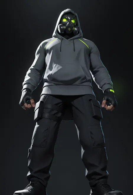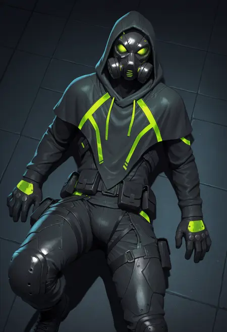 트리거 단어: txfs, 후드 착용, 마스크 착용, 가스 마스크, 빛나는 녹색 눈,