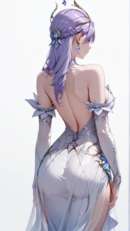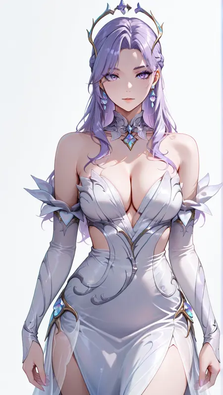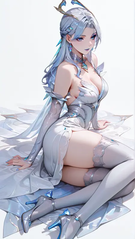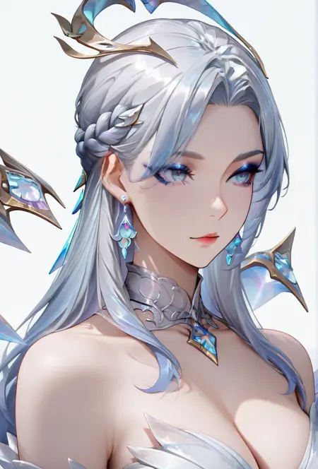 メインタグ: Kaisa、白いドレス、分離した翼、ジュエリー、イヤリング、裸の肩、フランス編み、青い目、化粧、青い髪、髪飾り、宝石、灰色の髪、分け目のある前髪、