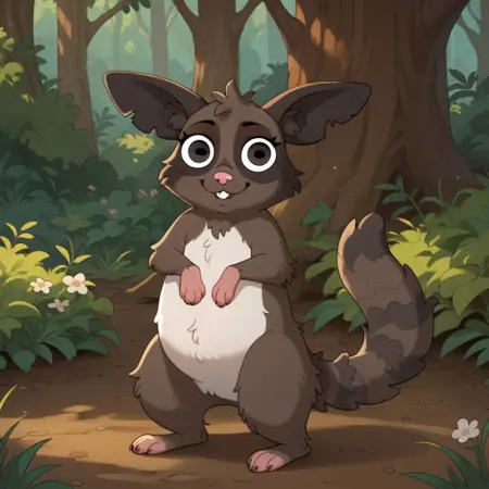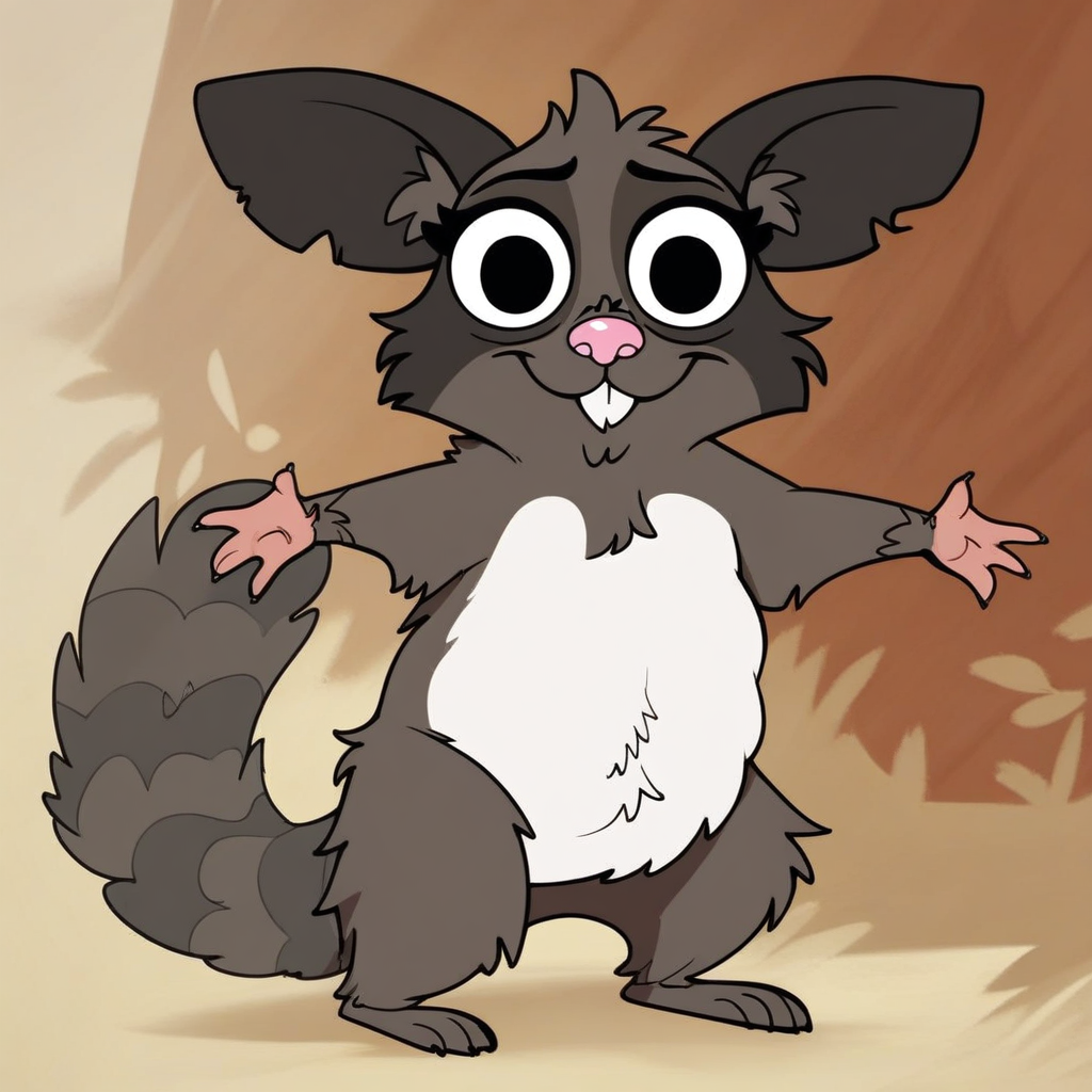 marsupial, sugar glider, gray and black fur, white belly fur, black eyes, pink nose, bucktooth, large ears, pink hands, fluffy striped tail,