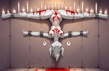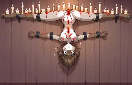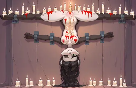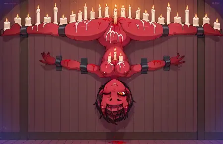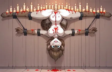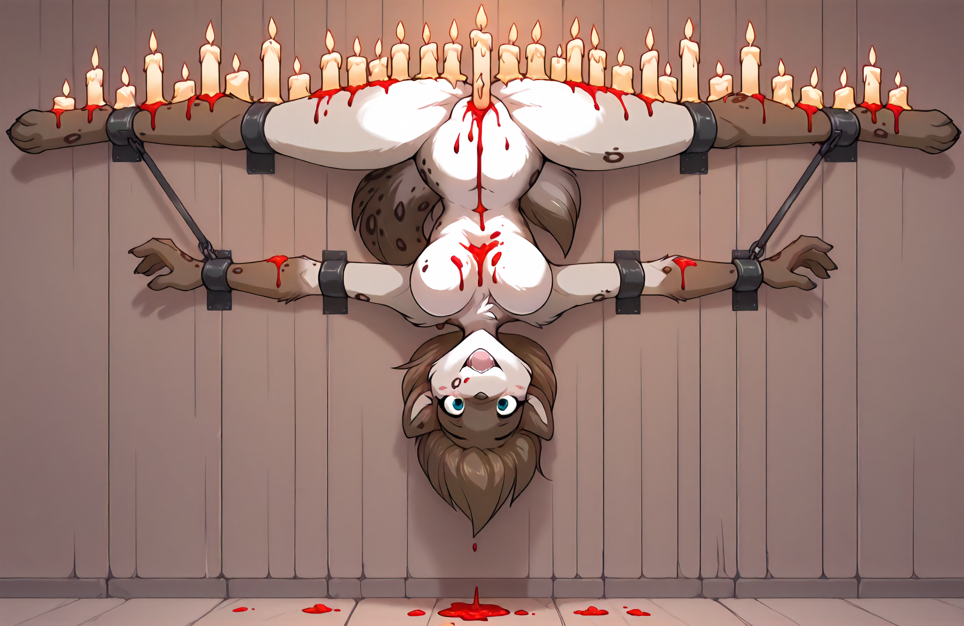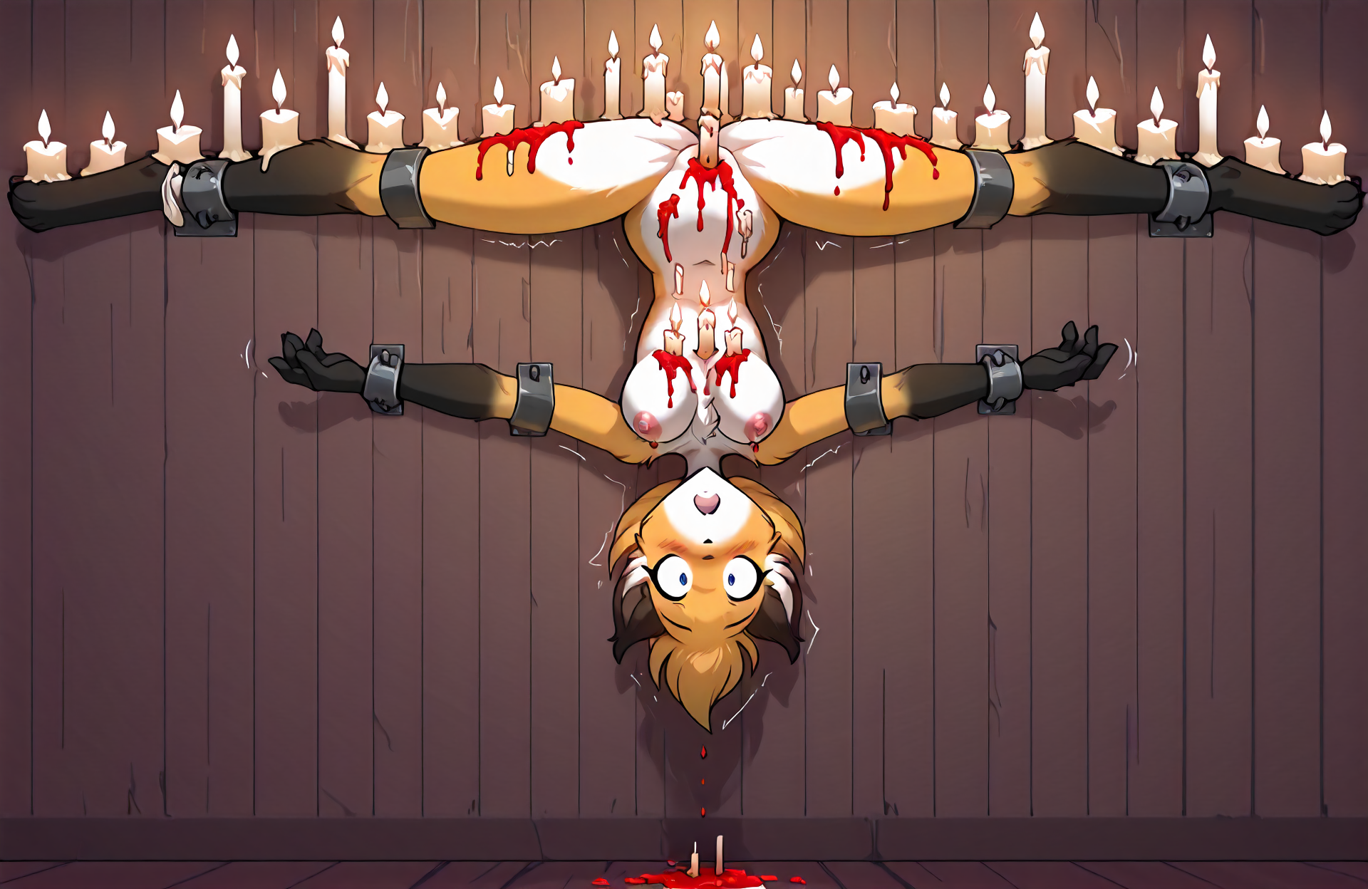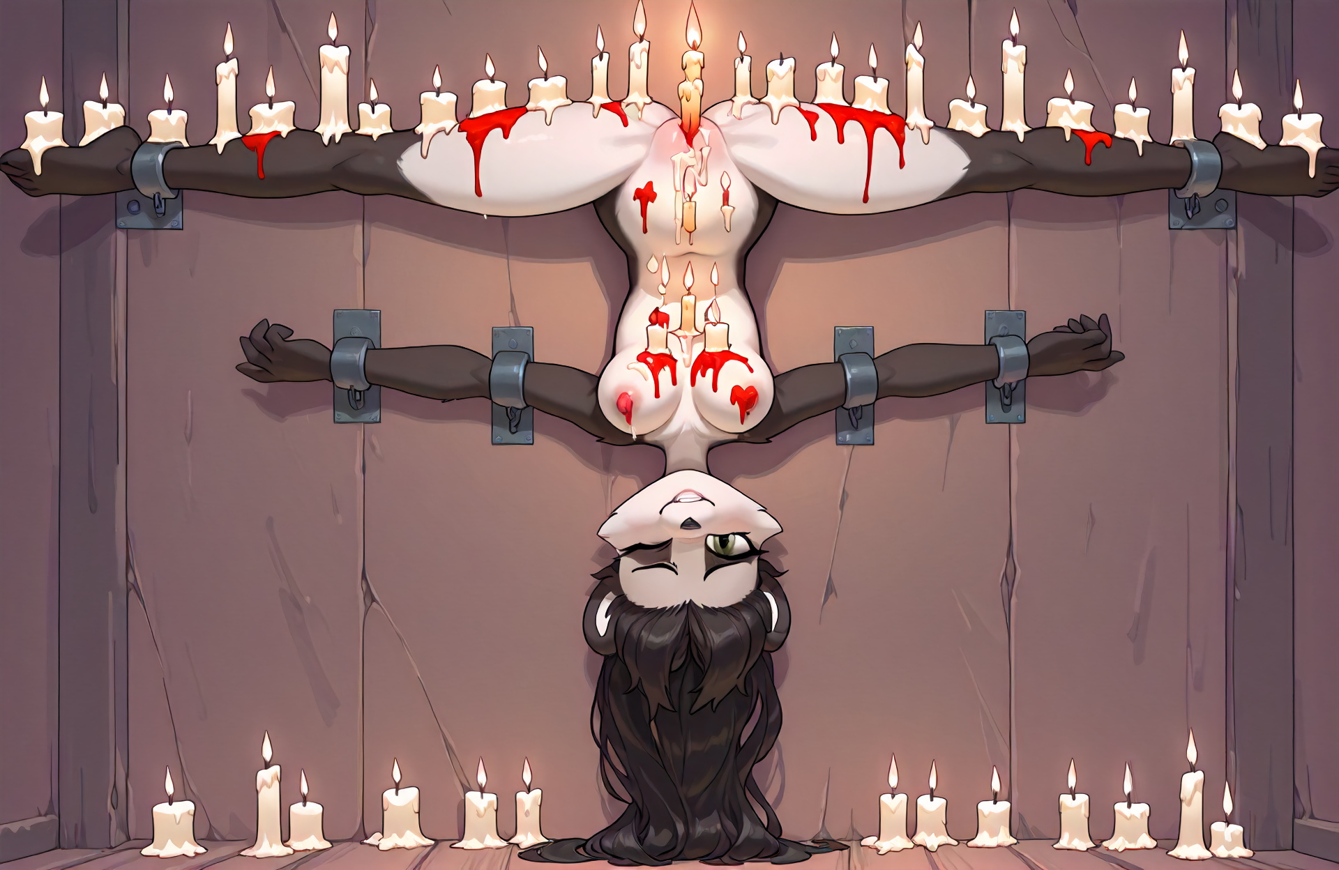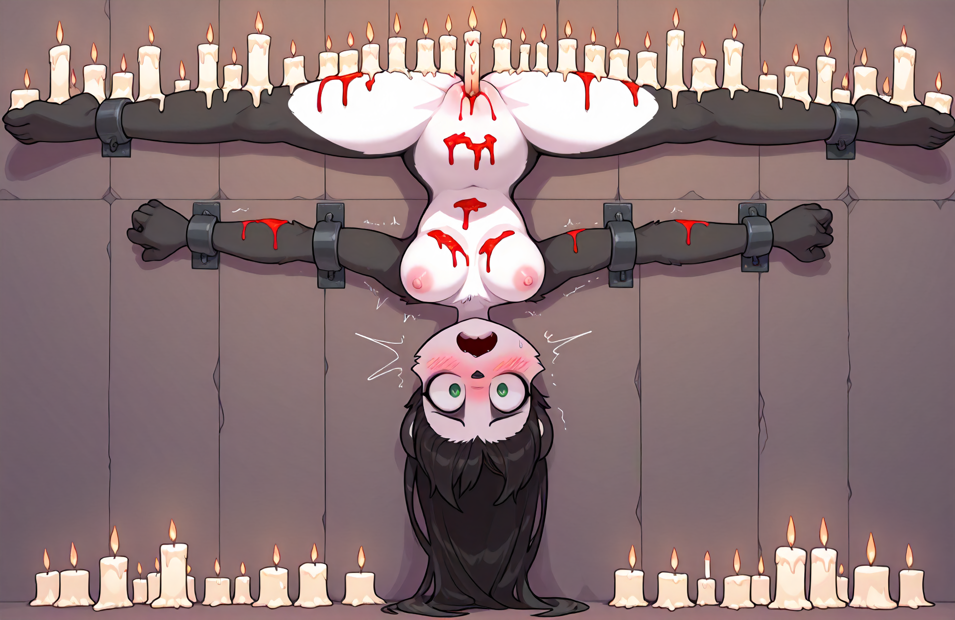 Reinforcement tags are: bondage, bdsm, bound to wall, full body, against wall, wall bondage, shackles, bolted to wall, wide spread legs, upside-down, spread arms, up against wall, candles, covered in candles, wax play, (candles on body:1.5), candle in pussy, vaginal object insertion, dripping wax
