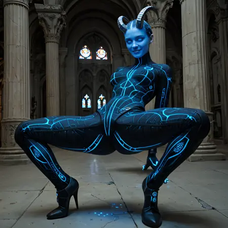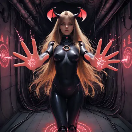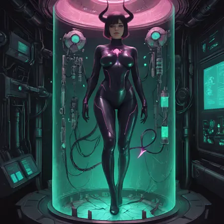 想象一个恶魔科技实验室,用盔甲、外骨骼和发光符文培育出一名成年魅魔。此SDXL套件提供生物机械装甲覆盖柔美曲线、角状植入物、尾状电缆以及活体金属紧身衣。她倚靠在约束柱上,从破裂的培养舱中走出,符文环绕她的手掌旋转,向你伸出手——充满危险而诱人的能量,却无露骨内容。