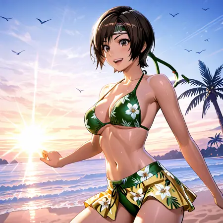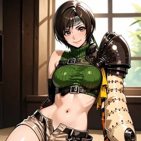 트리거: Yuffie, 1girl, yuffie kisaragi, crop top, white shorts, short hair, fingerless gloves, headband, midriff, sleeveless turtleneck, brown eyes, navel, shoulder armor, brown hair, medium breasts, green sweater, cropped sweater, short shorts, ribbed sweater, garter straps, single sleeve, bangs