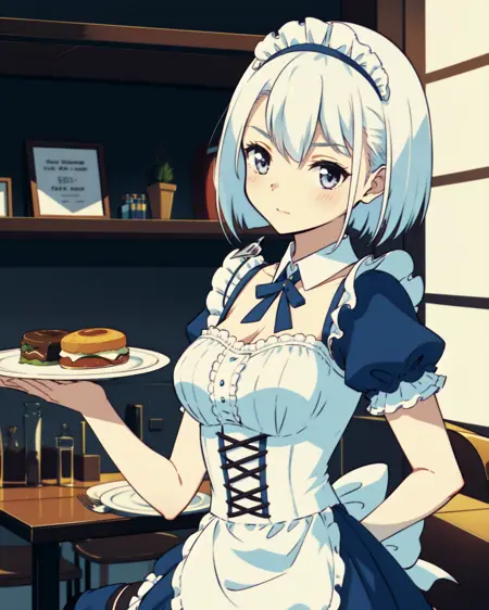 Maid outfit: mgrcizumikanagi, kngmai, maid headdress, white detached collar, blue cross tie, blue maid outfit, blue short puffy sleeves, white corset, wrist cuffs, white apron, white back bow, blue frilled skirt, black thighhighs