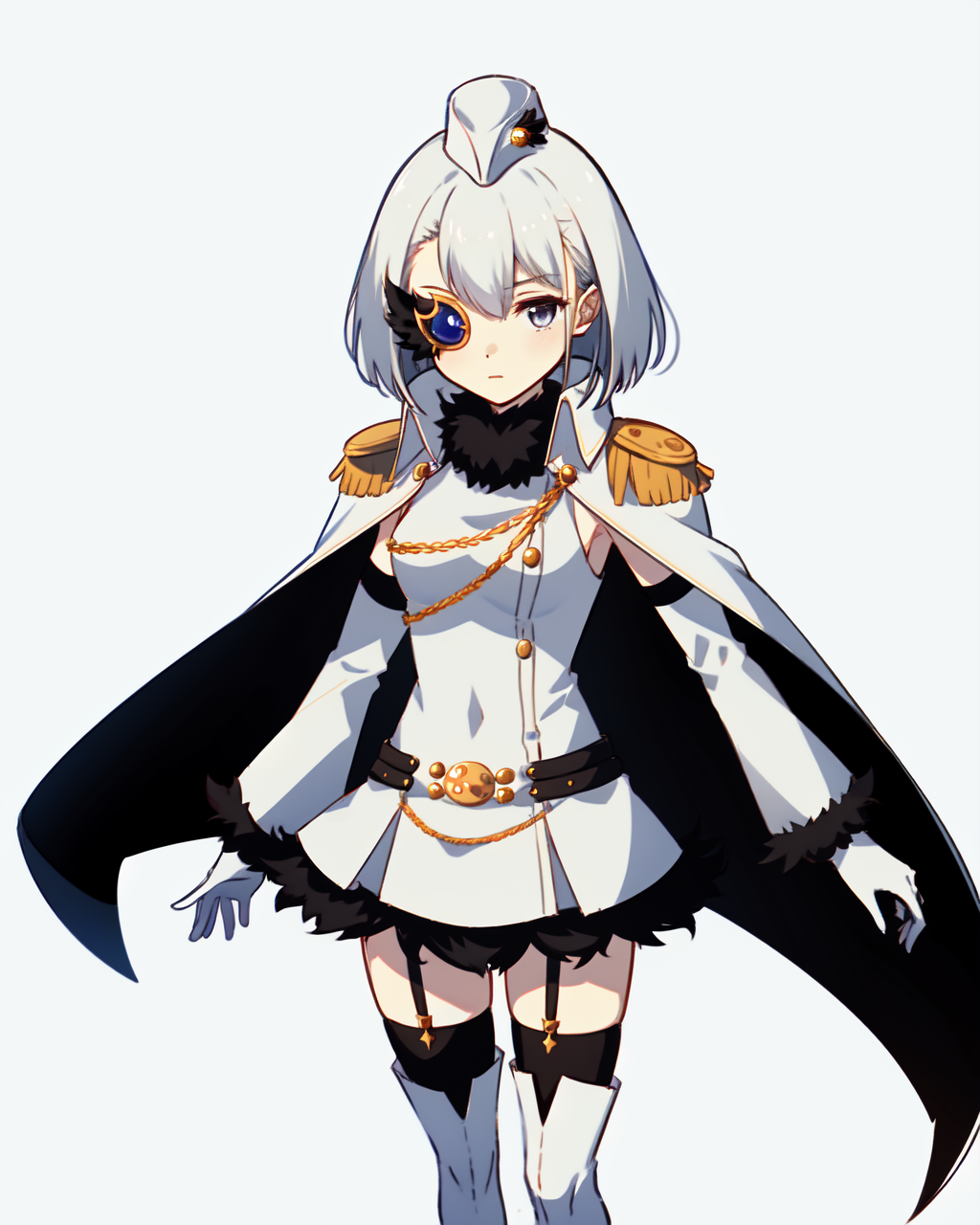 Magical outfit: mgrcizumikanagi, kngmgc, white garrison cap, gold monocle, one eye covered, white cape, gold epaulettes, white sleeveless dress, black fur trim, white detached sleeves, black belt, white gloves, black thighhighs, white legwear