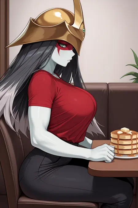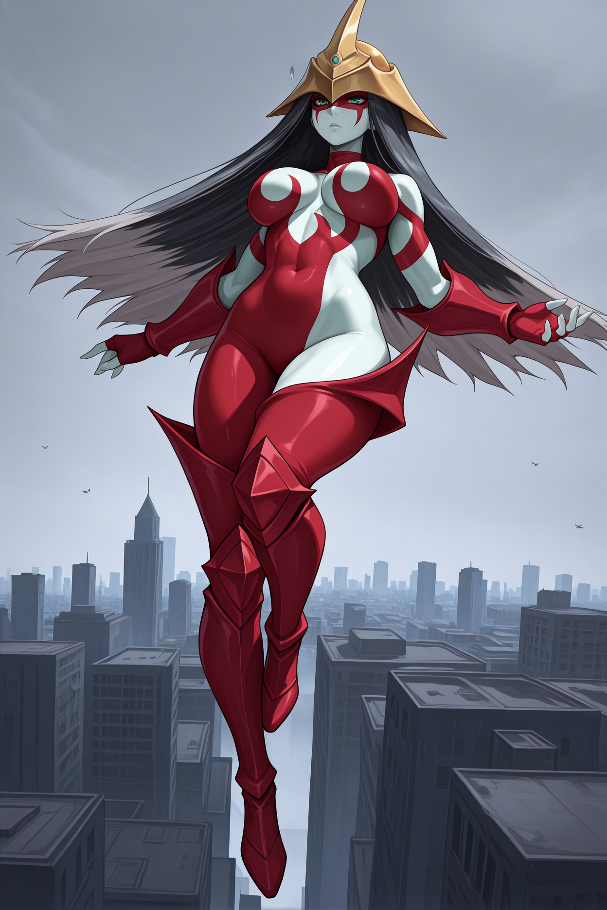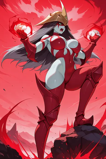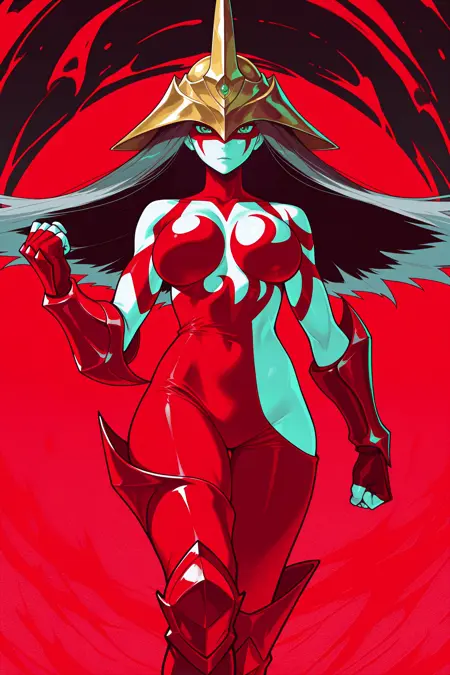 彼女の典型的な外見には、「ゴールドのヘルメット、赤いマスク、アイマスク、赤いボディスーツ、服の切り抜き、腰の通気孔、赤いガントレット、赤い手袋、指なし手袋、赤いブーツ」を追加してください。