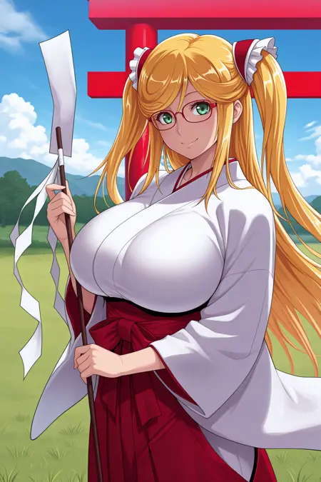 夏の教師の衣装には「tchshk, folded ponytail, sidelocks, blonde hair, green eyes, earrings, glasses, red-framed eyewear, white shirt, sleeveless shirt, white ascot, center frills, partially fingerless gloves, white gloves, black skirt, miniskirt, pencil skirt, garter straps, black thighhighs, red high heels」を追加してください。