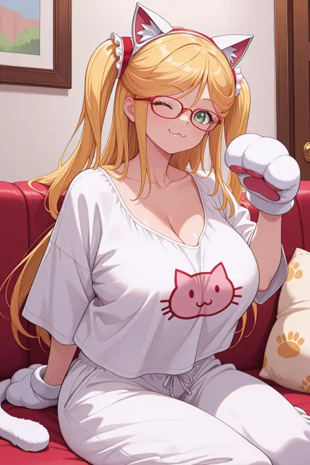 通常の姿には「defshk, long hair, two side up, blonde hair, green eyes, hair ornament, glasses, red-framed eyewear, red bodysuit, skin tight, fishnets, black gloves, elbow gloves, gauntlets, red thighhighs, high heels」を追加してください。