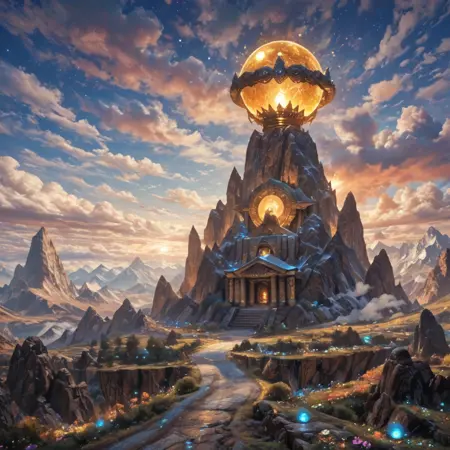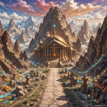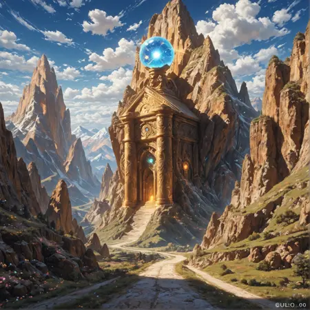 프롬프트: 기둥, 문, 돔, 기둥, 조각상, 산악 지평선, 산악 환경, 절벽...