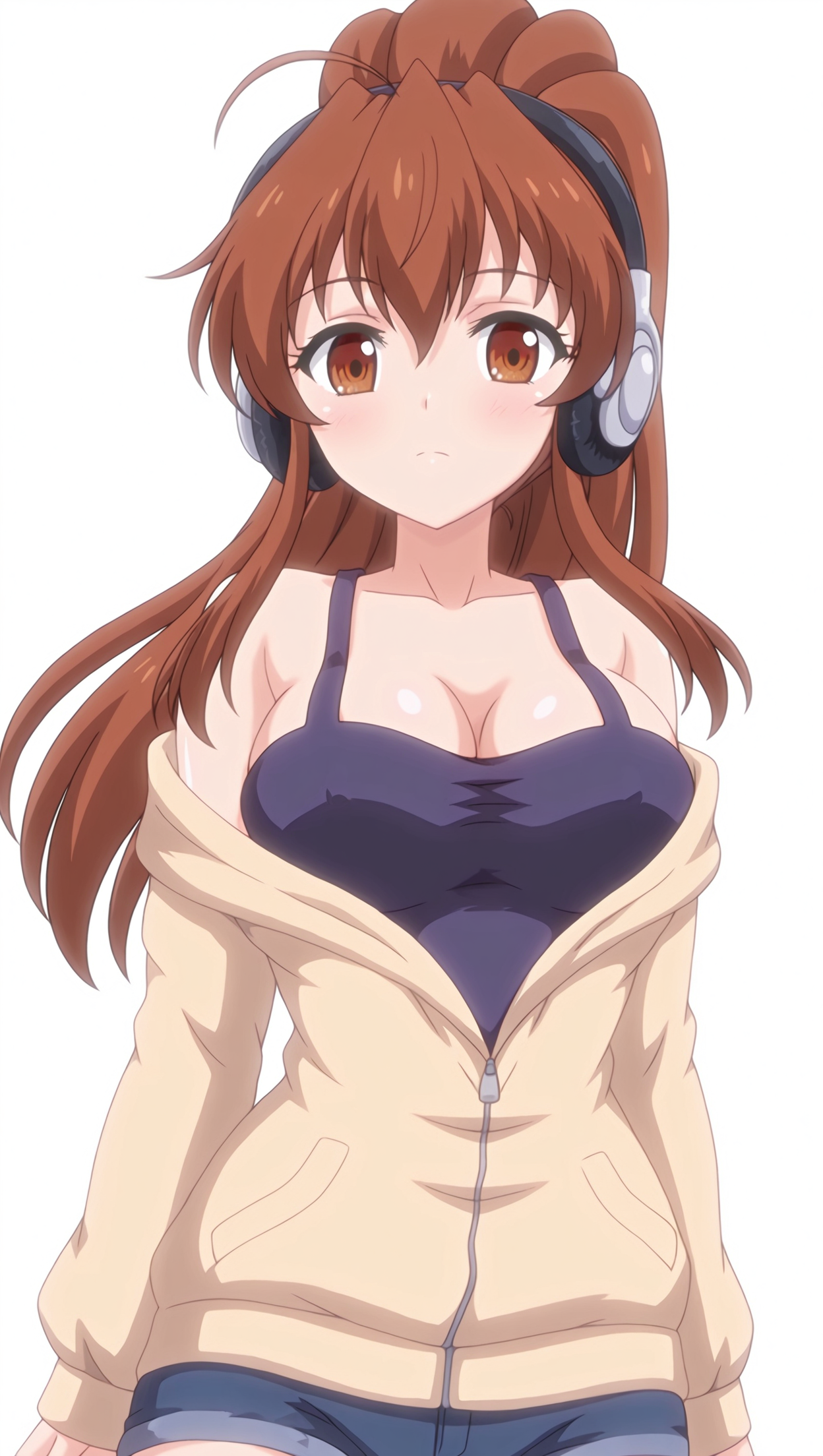 anime coloring, masterpiece, best quality, amazing quality, utakataayuri, 1girl, long hair, ponytail, brown hair, brown eyes, medium breasts, headphones, tank top, blue tank top, sweater, blue shorts, shorts, solo, pose, standing, looking at viewer, from front, ((((white background, simple background))))