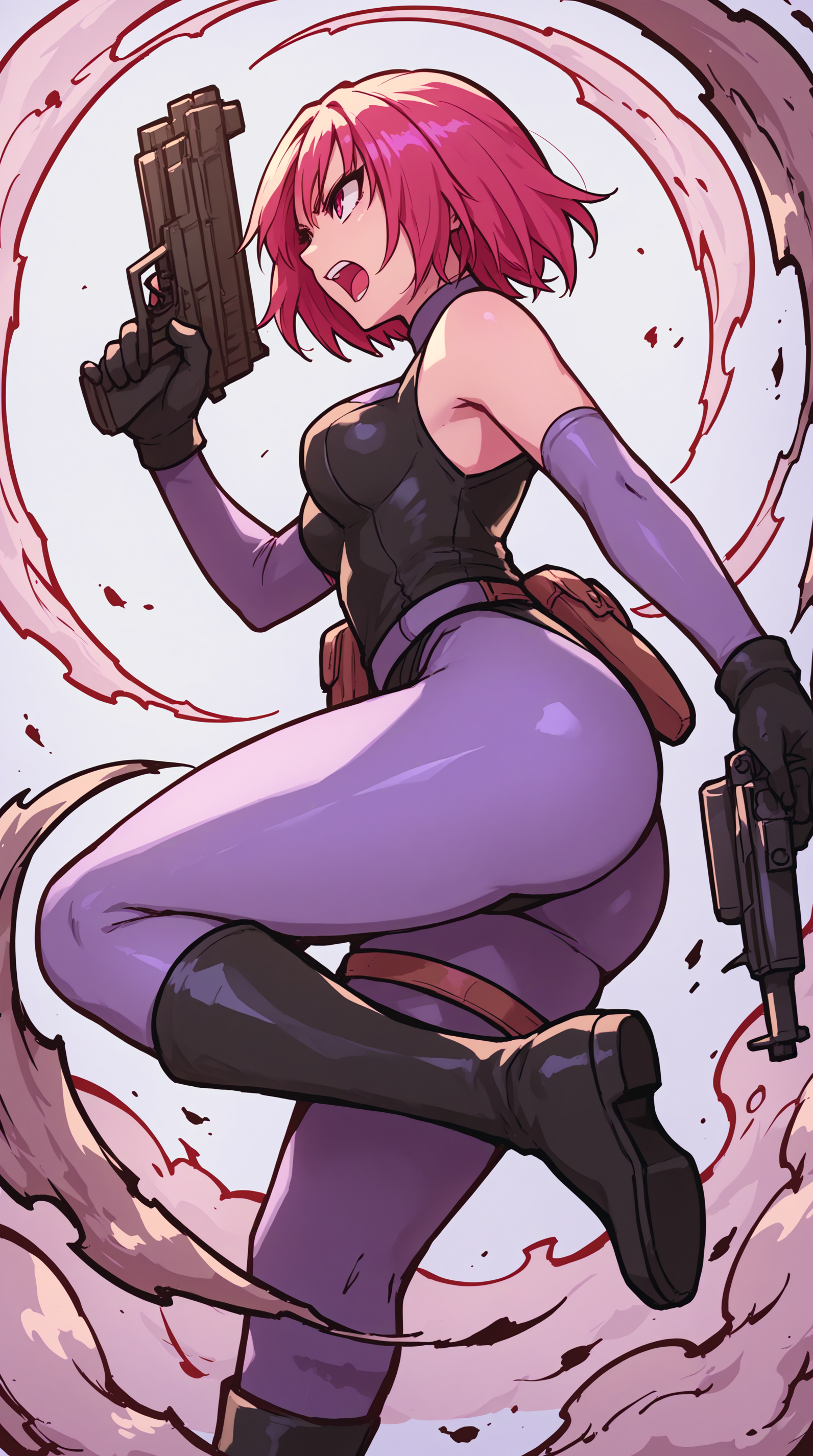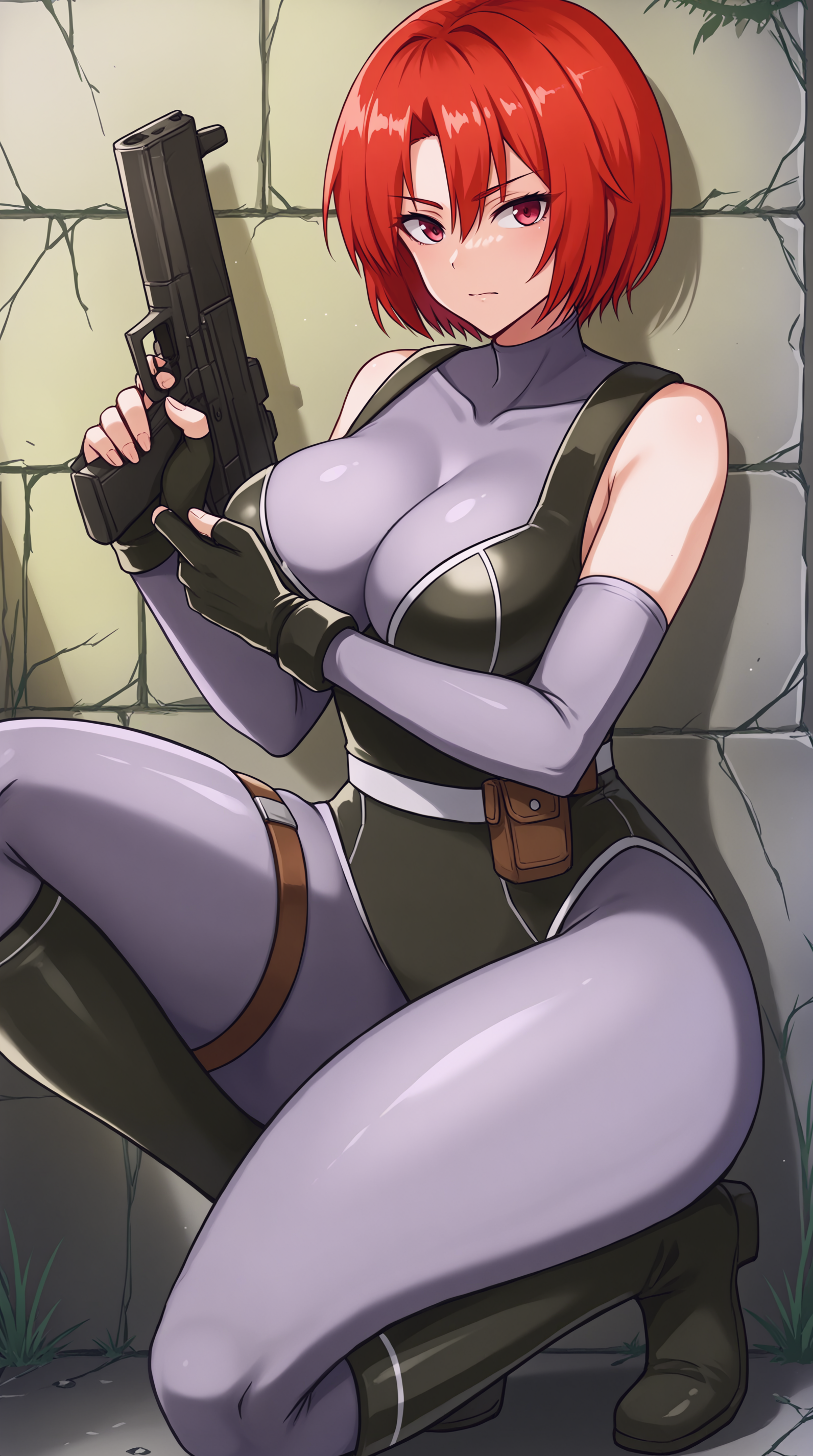 선택적 단어: 빨간 눈, 분리된 소매, 소매 없음, 팔꿈치 장갑, 검은 장갑, 손가락 없음 장갑, 검은 레오타드, 부츠, 바디수트