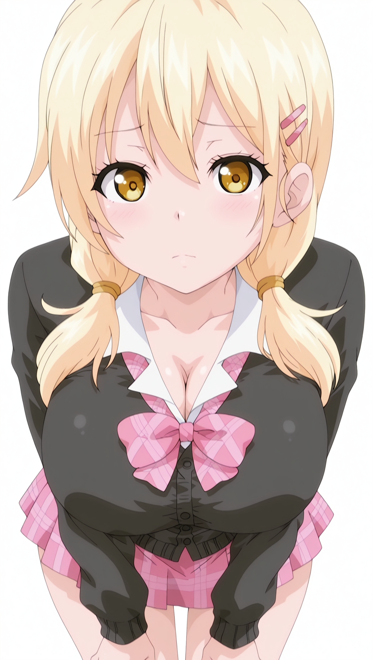 애니메이션 컬러링, 걸작, 최고 품질, 놀라운 품질, ruruna, 1girl, 긴 머리, 낮은 트윈테일, 금발, 노란 눈, 큰 가슴, 헤어클립, 재킷, 검은 재킷, 리본넥타이, 긴 소매, 치마, 분홍 치마, 솔로, 포즈, 서 있는 자세, 시청자 바라보기, 정면, ((((흰 배경, 단순한 배경))))