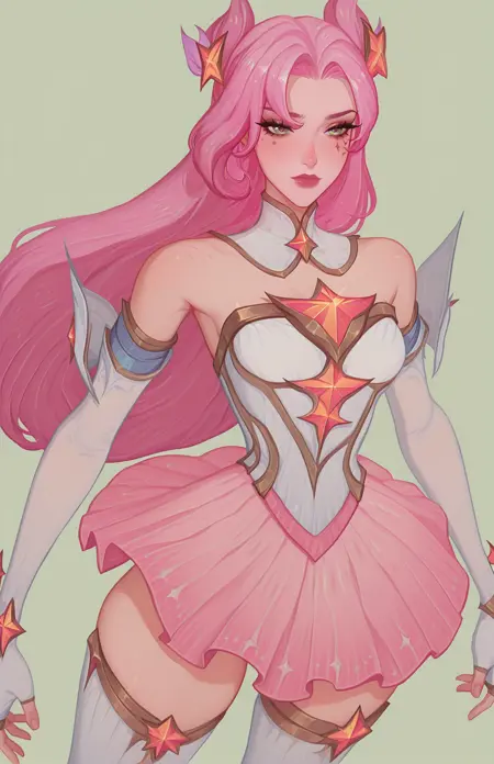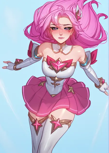トリガーワード:starguardiankaisa, ピンクの髪, 前髪分け, 長い髪, 目の下のマーク, 指なし手袋, 白いドレス, ピンクのスカート, 外したカラー, 外した袖, 髪飾り, ブーツ, 白い太ももハイ, 白い手袋,
