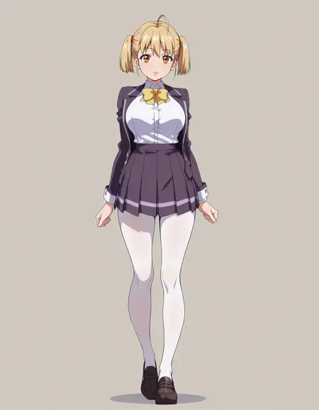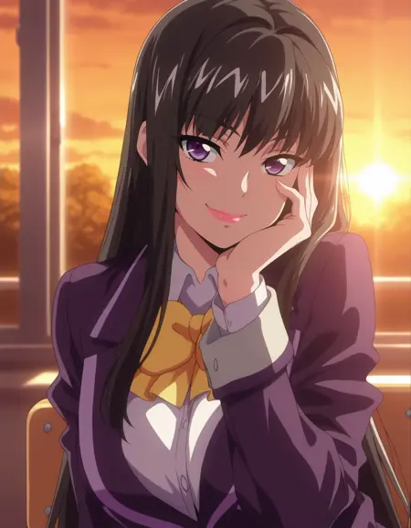 mai_byk,mai_ainnn,long_hair,black_hair,purple_eyes,pink_lips,yellow_bow,dark_blue_school_uniform,pleated_skirt,black_pantyhose,loafers