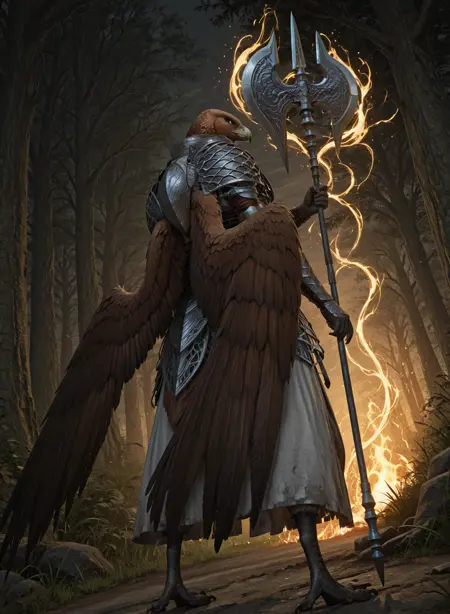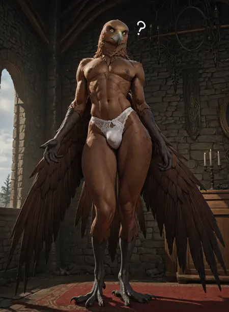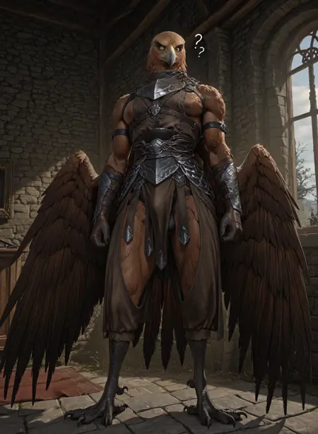 guardian_ntg, male, eagle, brown feathers, yellow eyes, bird legs, wings, medieval armor, brown pants, white tailcoat,