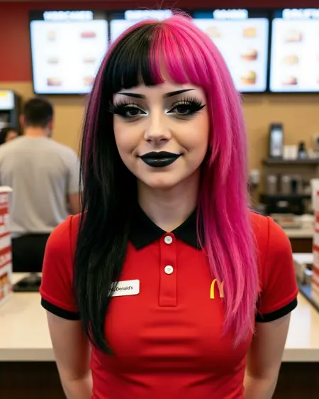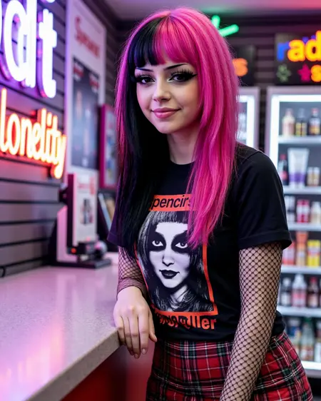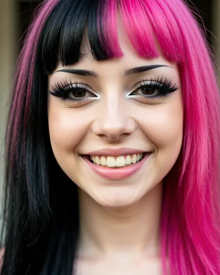 masterpiece, best quality, ultra detailed, 1girl, split color hair pink and black, blunt bangs, heavy eyeliner, pale skin, black leather harness lingerie, bathroom tiles background, dim lighting, seductive expression, looking at viewer