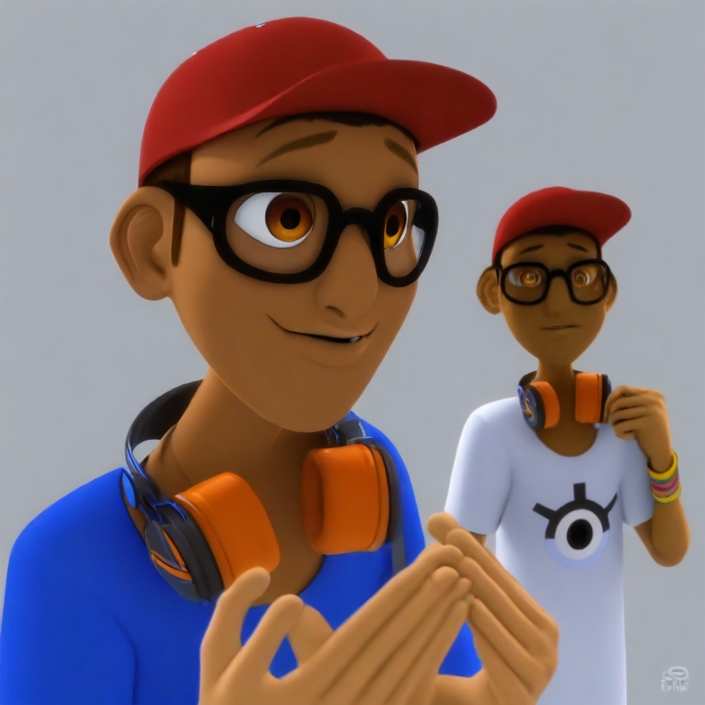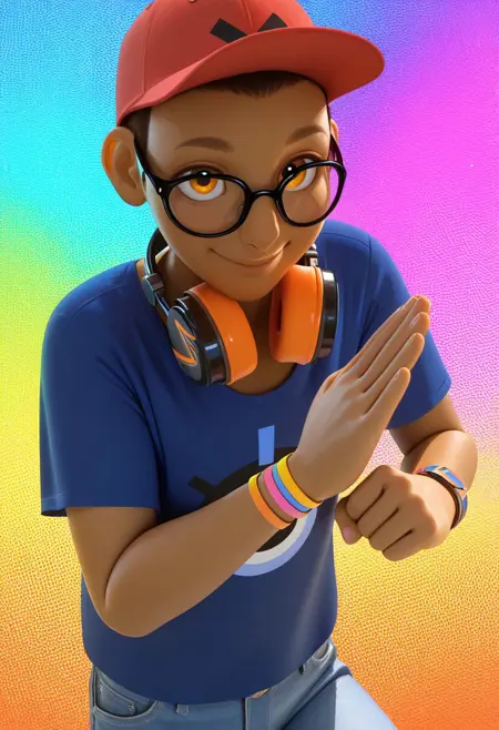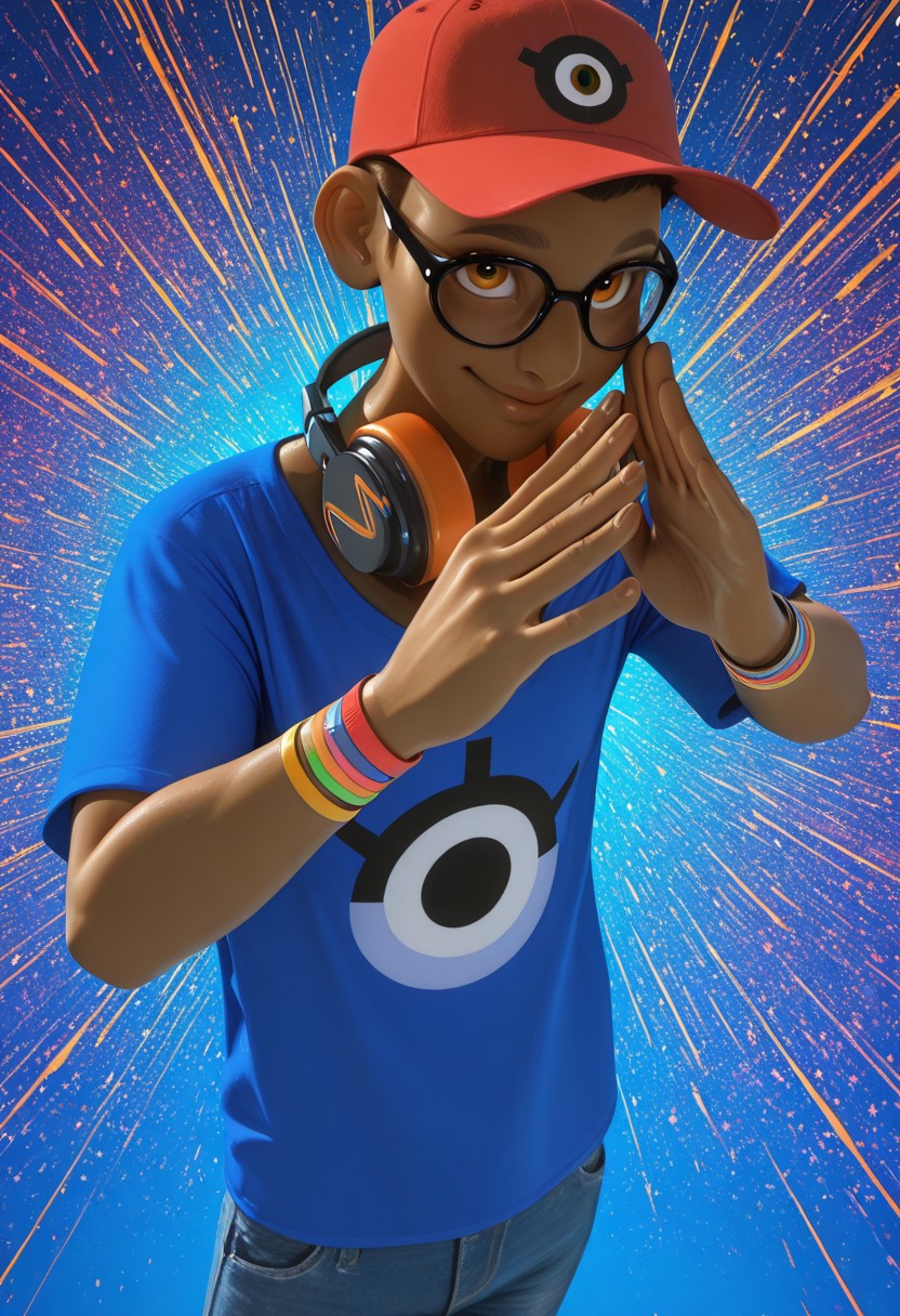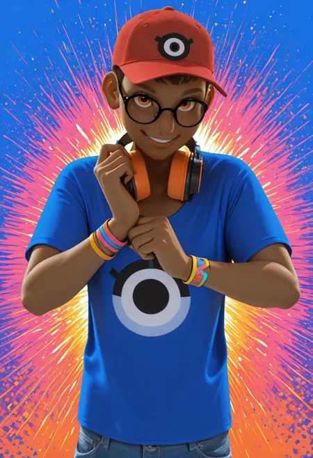 plain red cap, black-frame eyewear, glasses, headphones on neck, azure-blue t-shirt, eye-design on t-shirt, blue jeans, multiple wristbands on wrist, red-white sneakers,