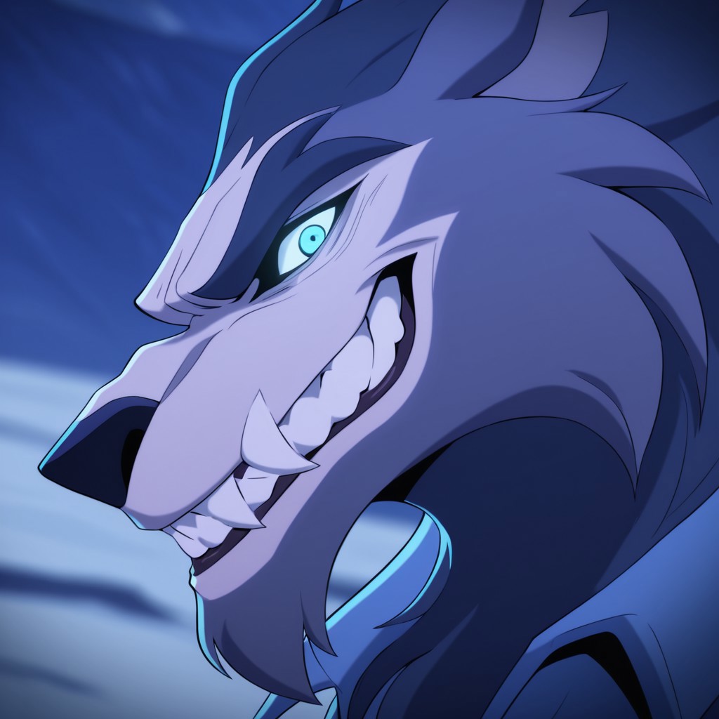 mordex, werewolf, grey fur, white underbelly, cyan eyes, light blue vest, blue shorts, wrist bandages