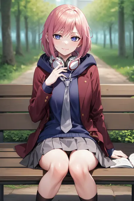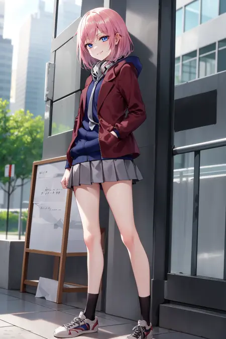 Tags: school uniform, miniskirt, jacket, pleated skirt, hoodie, headphones around neck, sneakers, black socks, grey skirt (check the example images for more tags).