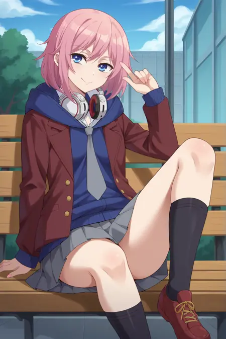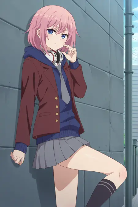 Tags: school uniform, miniskirt, jacket, pleated skirt, hoodie, headphones around neck, sneakers, black socks, grey skirt (check the example images for more tags).