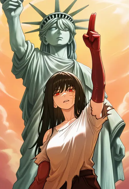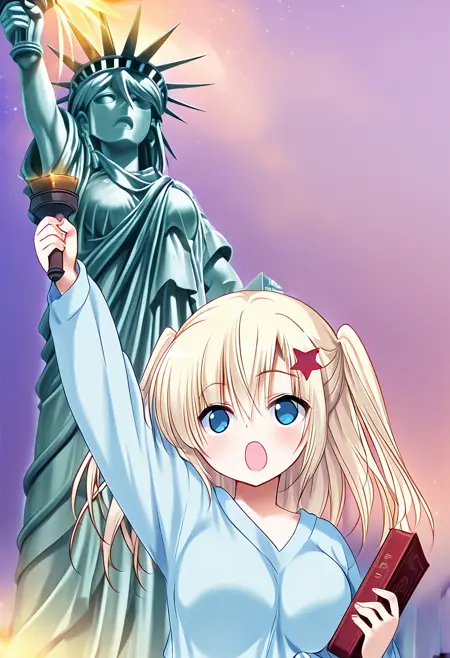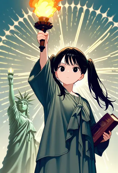 레이디 리버티의 자세로 캐릭터를 생성하기 위한 LoRa입니다. 기본적으로 한 손에는 토치를 들고 팔을 위로 뻗고, 다른 손에는 책이나 돌 판을 들고 있습니다. 하지만 캐릭터가 음식 같은 다른 물건을 들거나, 물건 없이 단순히 팔만 위로 뻗도록 만들 수도 있습니다. 레이디 리버티와 유사한 복장도 생성할 수 있습니다. 권장 가중치는 0.5–1.0입니다. 배경에 조각상이나 건물이 나타나지 않도록 하려면 부정 프롬프트에 "statue"와 "building"을 포함하세요.