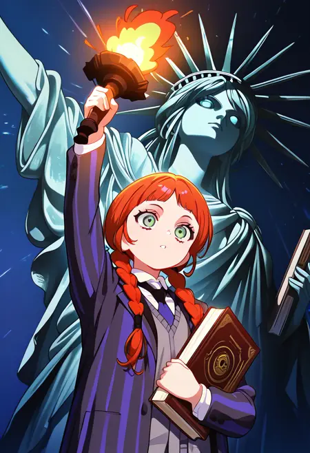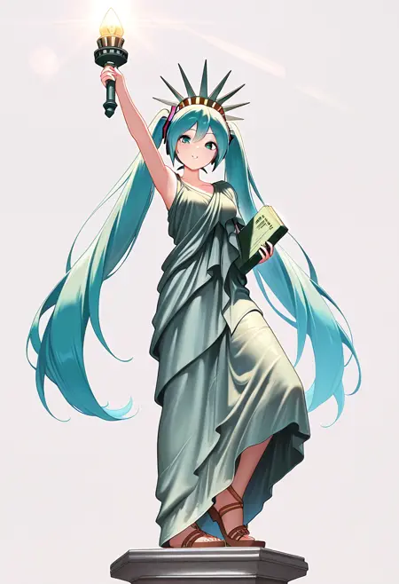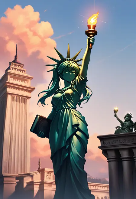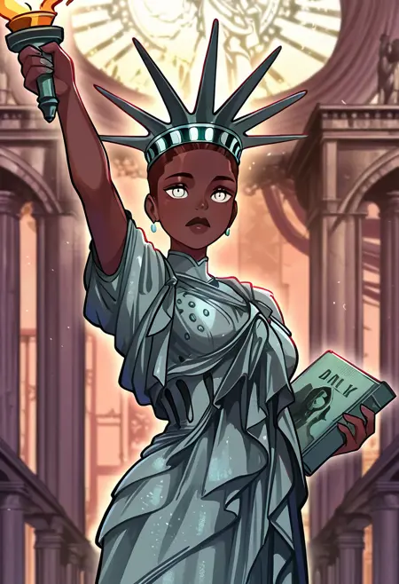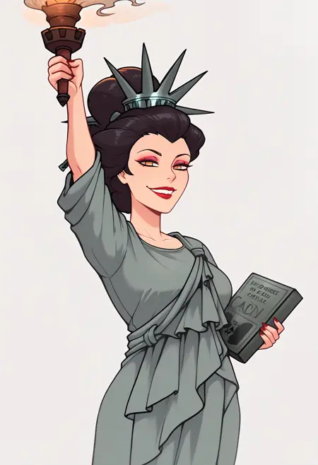 트리거 단어: ladylibertypose, arm up, holding torch, holding book