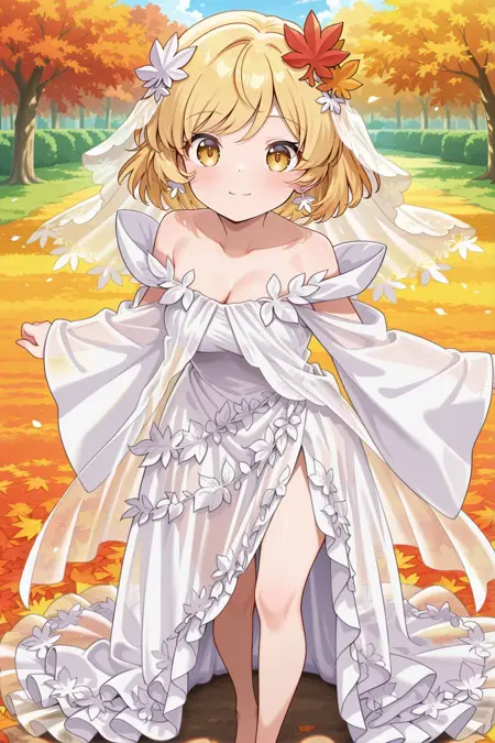 aki shizuha, 1girl, solo, yellow eyes, blonde hair, short hair, leaf hair ornament,, aki shizuha \(platinum-white fall\), bridal veil, leaf hair ornament, white leaf earrings, cleavage, off-shoulder dress, wedding dress, white dress, leaf-trimmed dress, wide sleeves, see-through overskirt, barefoot,
