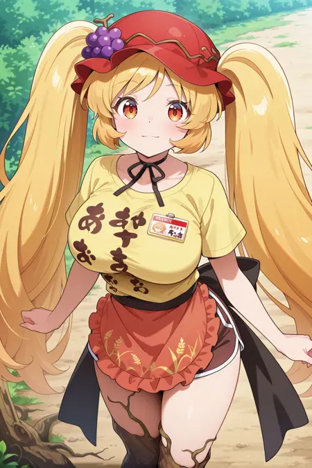 aki minoriko, 1girl, yellow eyes, blonde hair, long hair, twintails, plant roots legs, alraune, aged up, large breasts,, aki minnoriko \( super food court goddess\), alternate costume, red hat, baseball cap, grape hat ornament, black neck ribbon, yellow shirt, t-shirt, short sleeves, cloth writing, id card, waist apron, brown apron, back bow, black bow, brown shorts, dolphin shorts,