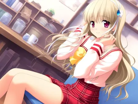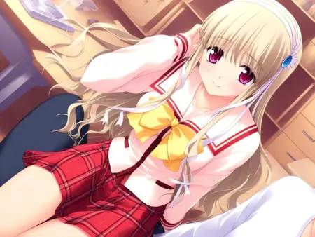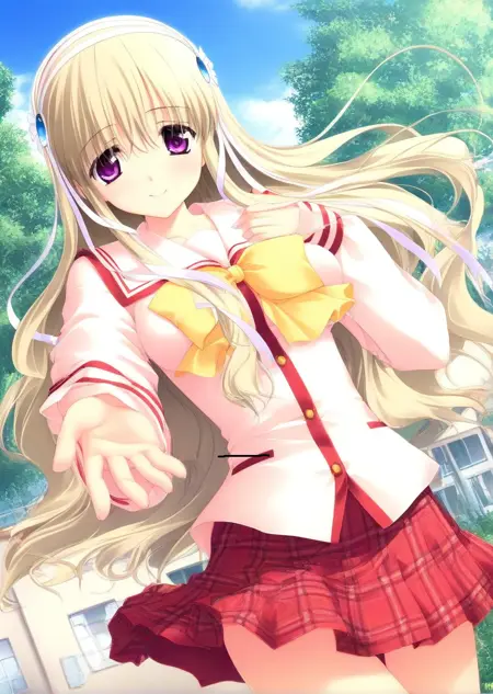 school uniform, plaid skirt, red plaid, Yellow bow.