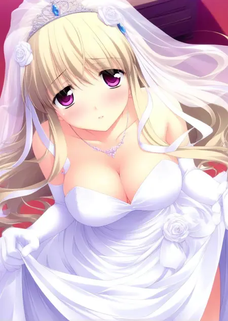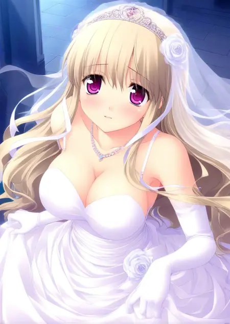 Maezono_Clarissa_Satsuki, 1girl, solo, blonde hair, long hair, hair ribbon, purple eyes, breasts, hair ornament,