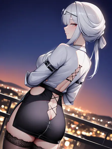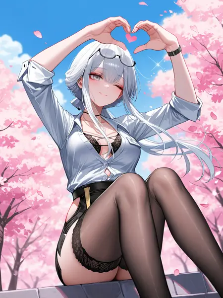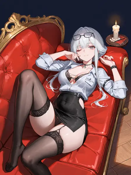 プロンプト:Chenxing, Chenxing - Jade Arc_(Tender Agenda), grey eyes, white hair, air short hair with long locks, black-framed eyewear, eyewear on head, black thighhighs,