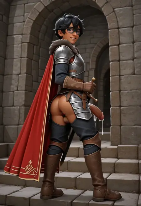 기사 복장, 갑옷, 가슴판, 어깨판, 망토, 빨간 망토, 모피 트림, 벨트, 장갑, 갈색 장갑, 부츠, 검, 검집, 무기, 전체 세트 복장, 중세 판타지, 상세한 직물, 금속 질감, 복장 중심, 판타지 기사 장비