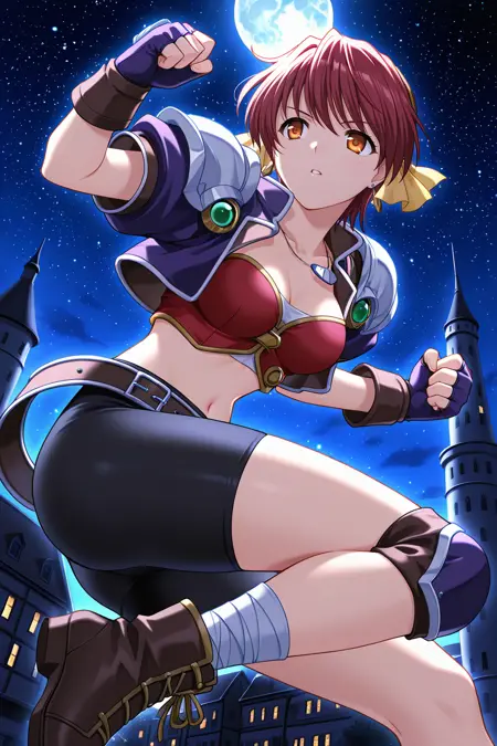 earrings,purple jacket,crop top jacket,open jacket,green gem,puffy short sleeves,shoulder armor,necklace,dog tags,collarbone,red bustier,button badge,cleavage,purple gloves,fingerless gloves,midriff,navel,stomach,belt buckle,brown belt,loose belt,black shorts,bike shorts,spandex,knee pads,ankle bandages,ankle boots,brown footwear,