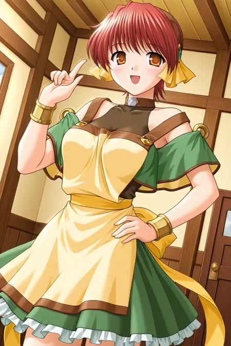 waitress,choker,green gem,pinafore dress,yellow shirt,green apron,yellow sleeves,puffy short sleeves,arm ribbon,wristband,shoulder blades,yellow bow,wrist cuffs,