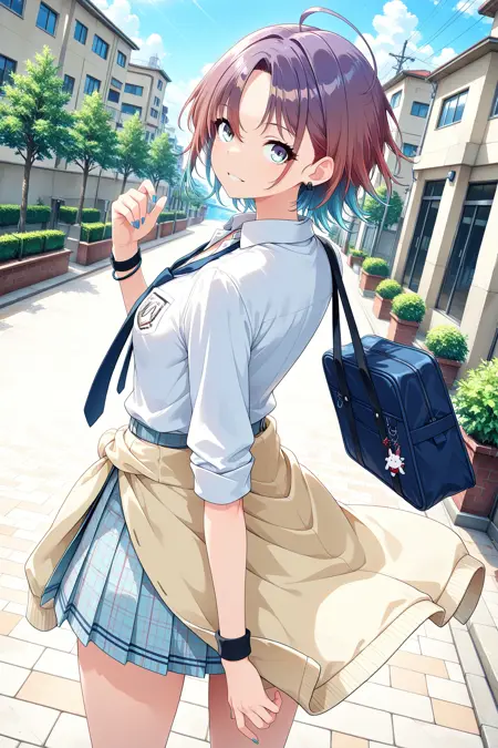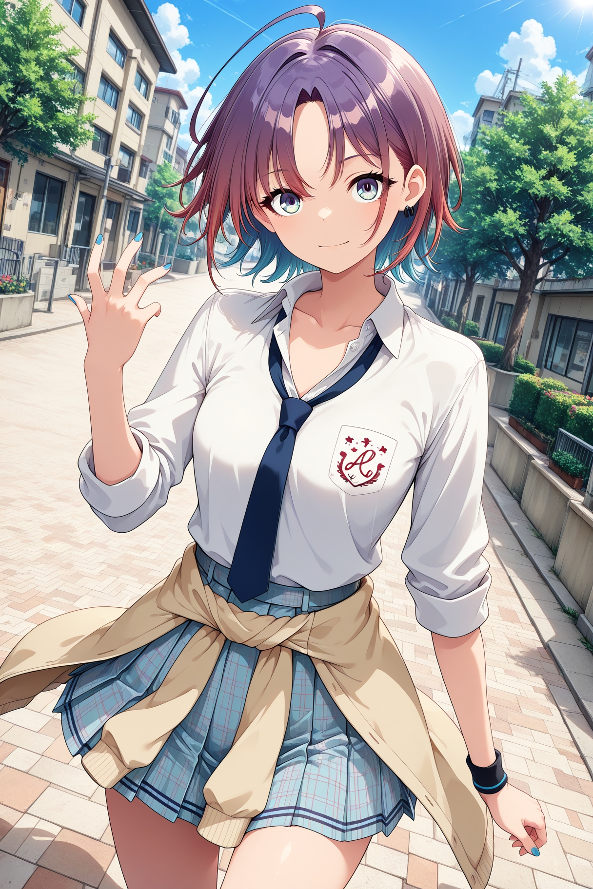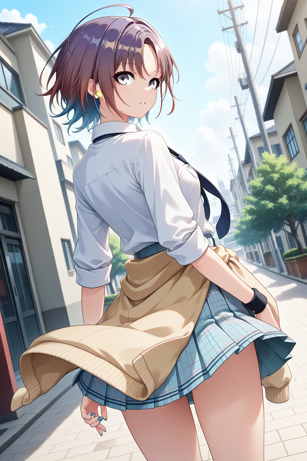 衣装:カーディガン、ベージュのカーディガン、腰に巻きつけたカーディガン、腰に服を巻きつけた、ゆるいネクタイ、白いシャツ、開いたカラー、チェック柄、チェックのスカート、プリーツスカート、学校制服、スカート、袖をまくった、リストバンド、衿付きシャツ