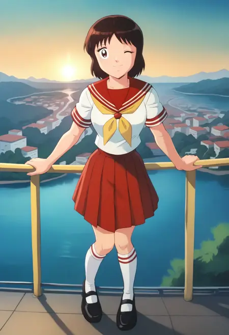 빨간 선원 칼라, 노란 넥커치프, 하얀 세라후쿠, 빨간 치마, 흰색 무릎높이 양말, 검은 신발