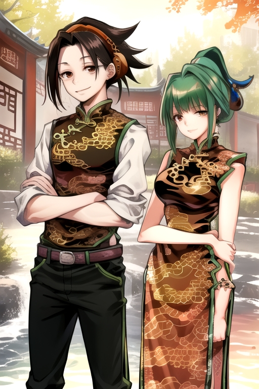 YohJun, (a man, black hair) and (a woman, green hair, chinese dress, folded ponytail), hetero, standing, smile, cowboy shot