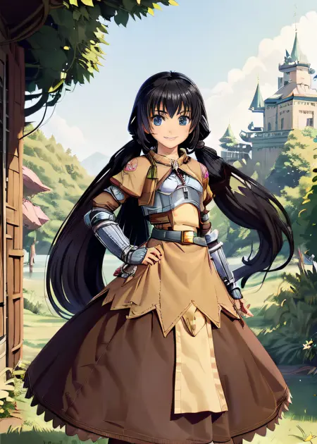 prompt: swdro, armor, capelet, armored dress, belt, armored gloves, long brown skirt