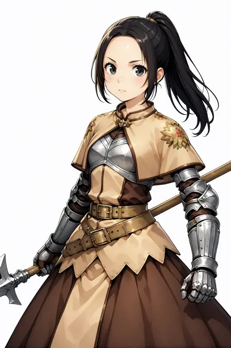 プロンプト:swdro, breastplate, brown capelet, dress, belt, armored gloves, long skirt, brown skirt, gauntlet, multiple belts, yellow gloves, boots