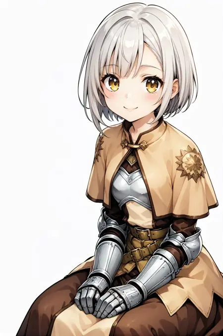 プロンプト:swdro, armor, capelet, armored dress, belt, armored gloves, brown skirt
