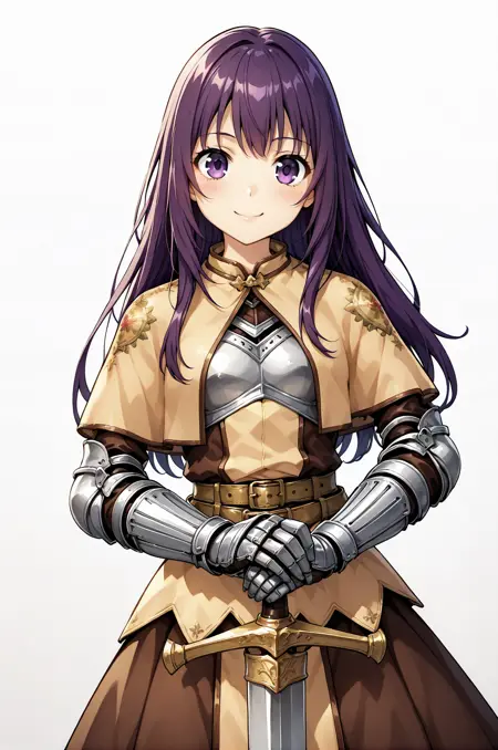 プロンプト:swdro, armor, capelet, armored dress, belt, armored gloves, long brown skirt