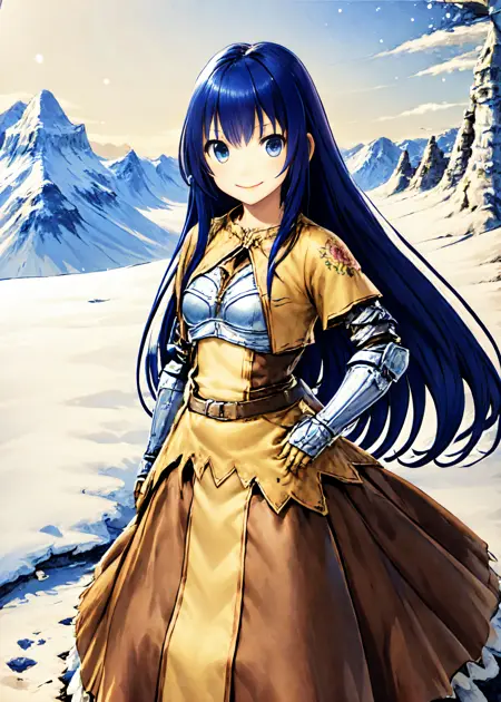 提示词:swdro,铠甲,短斗篷,护甲连衣裙,腰带,护甲手套,长棕色裙