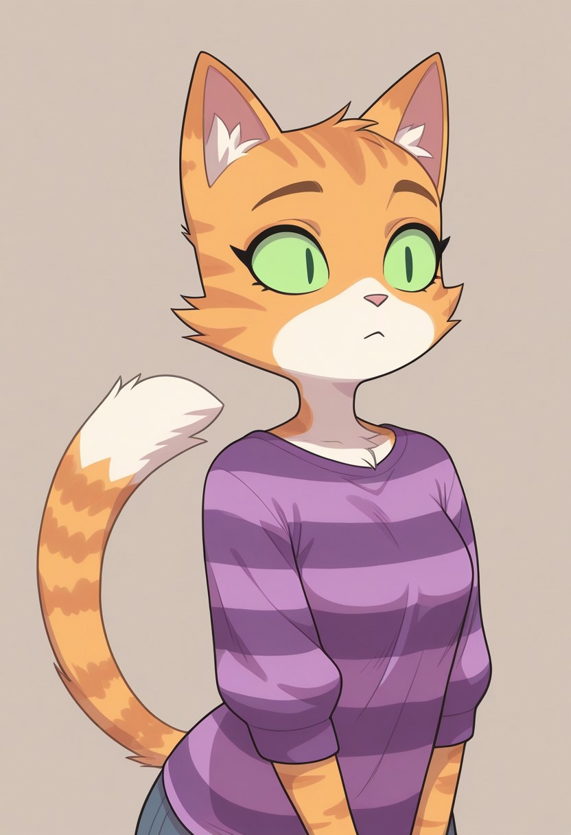 furry,1girl,cat ears,cat tail,striped,purple shirt,