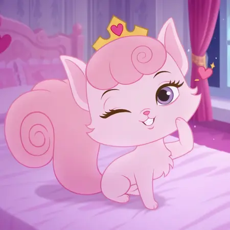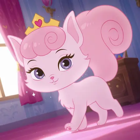 Tags: cat, feral, animal, animal focus, golden tiara, pink fur, pink hair, curly hair, purple eyes, pink nose, eyelashes, pink tail,