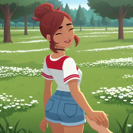 カジュアル装備:お団子髪、Tシャツ、チョーカー、デニムショートパンツ、スニーカー