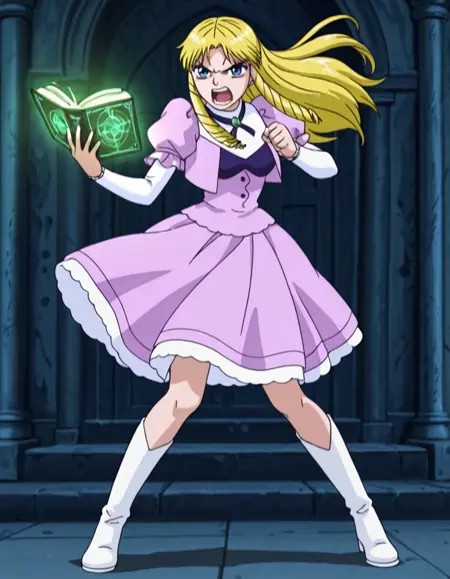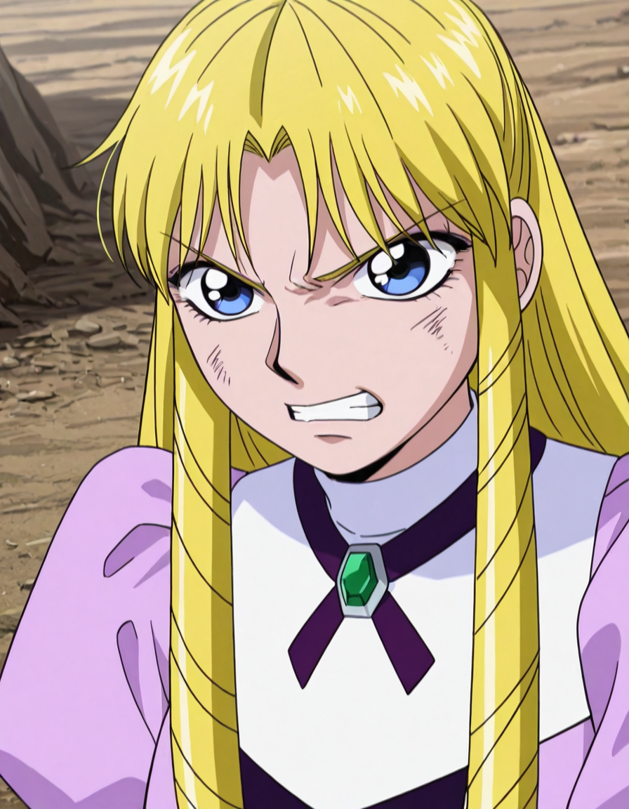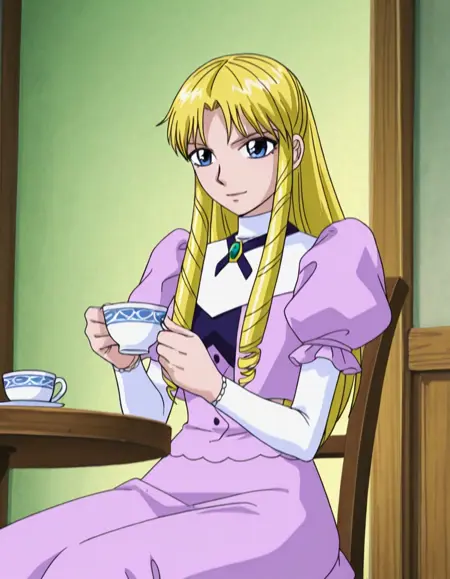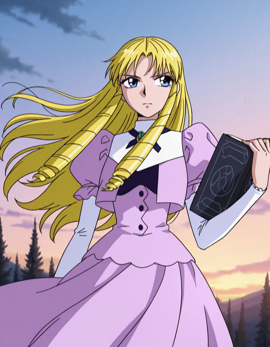 훈련 프롬프트: sherrychan, sherrybelmont, 긴 머리, 금발, 파란 눈, 머리 드릴, 보라색 드레스, 풍성한 소매