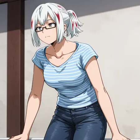• 带蓝衬衫的触发词:FuyumiMHABlueShirt, 1girl, pants, glasses, striped shirt, multicolored hair, semi-rimless eyewear, white hair, red hair, grey eyes, ponytail, short sleeves, collarbone, streaked hair, blue shirt, short hair, denim, two-tone hair, jeans