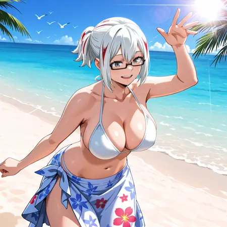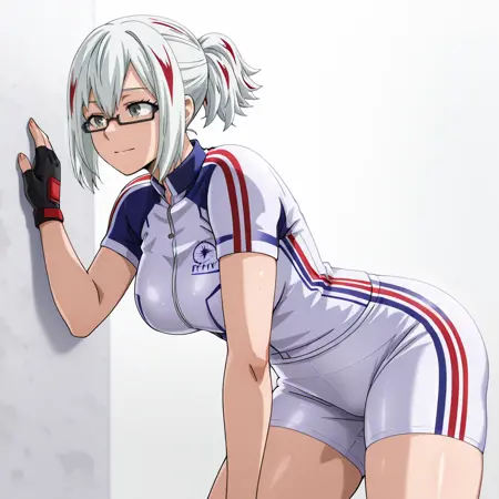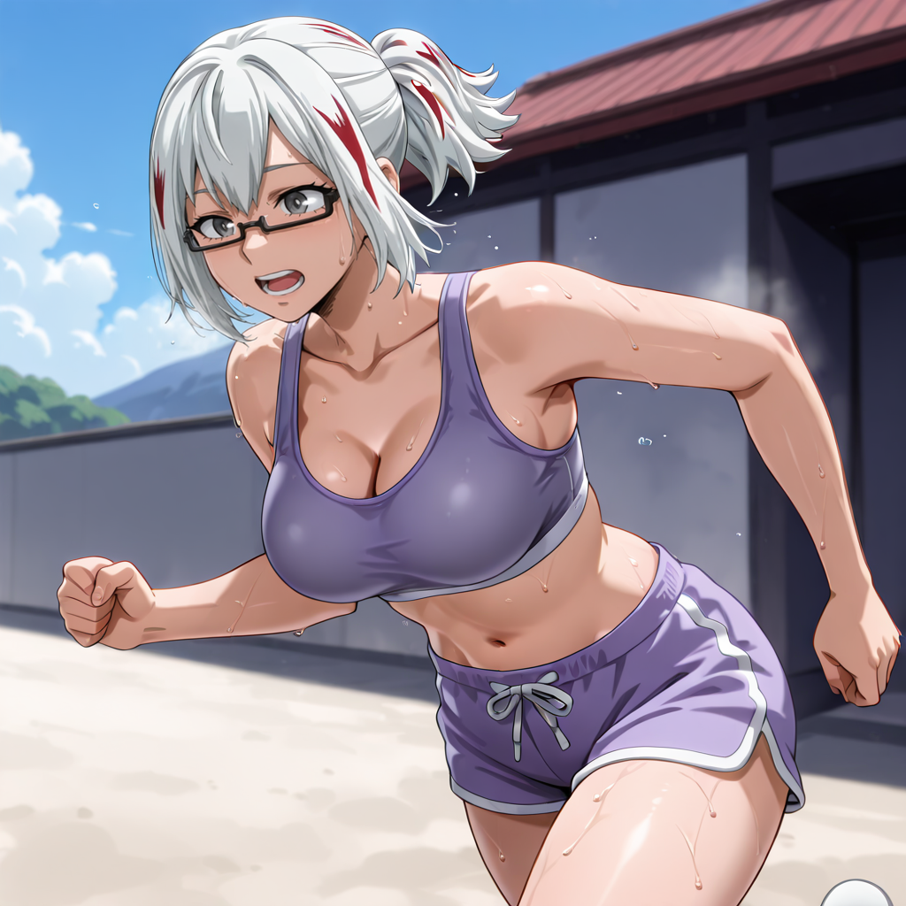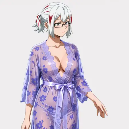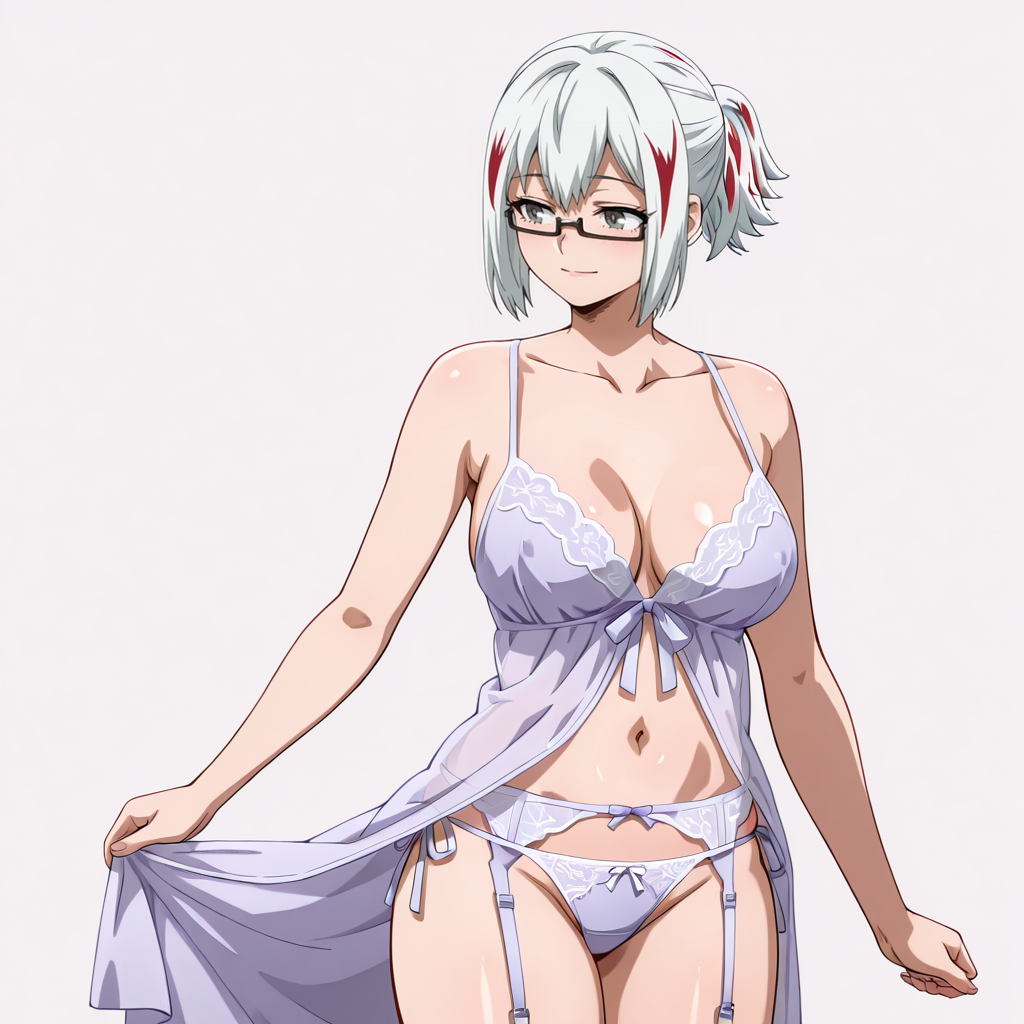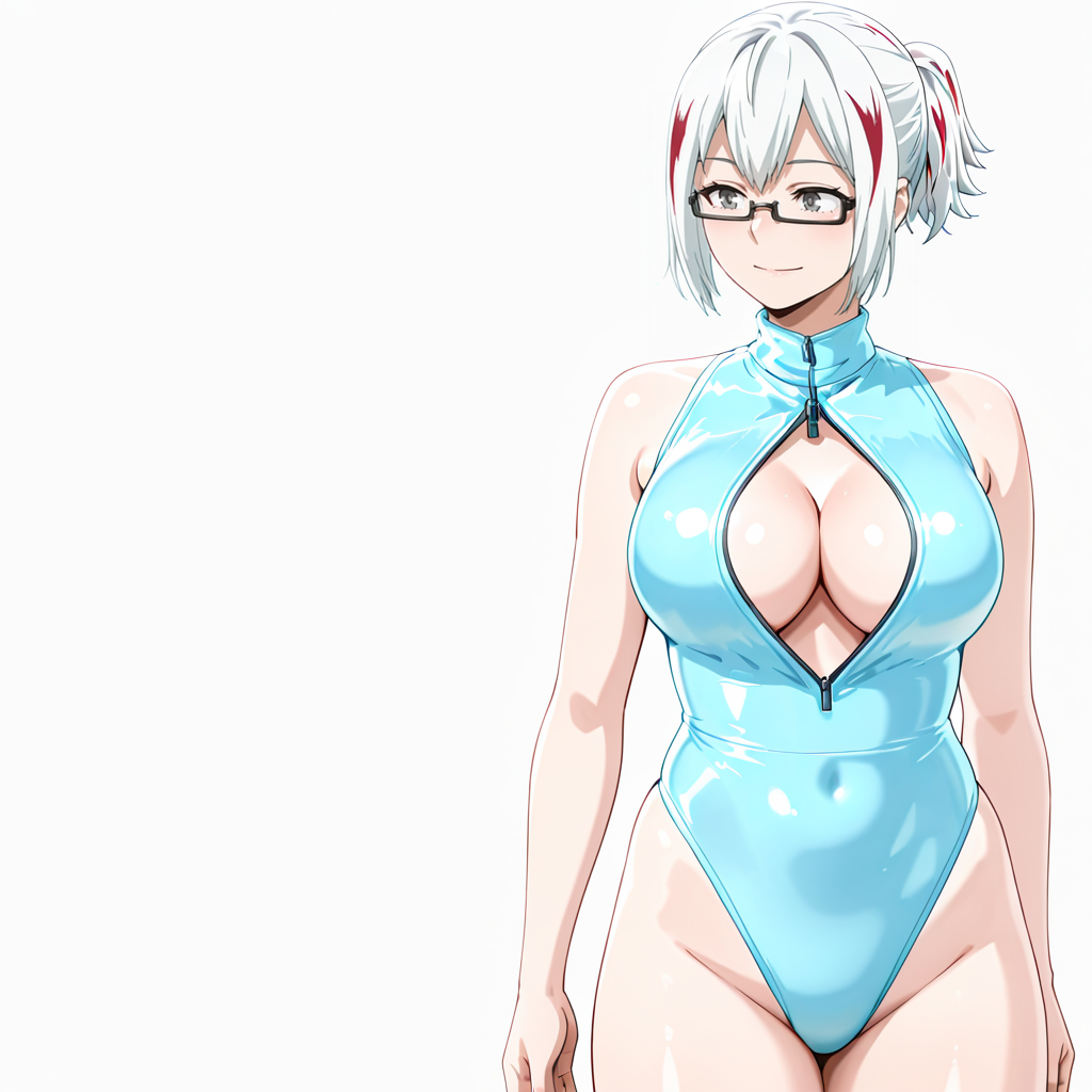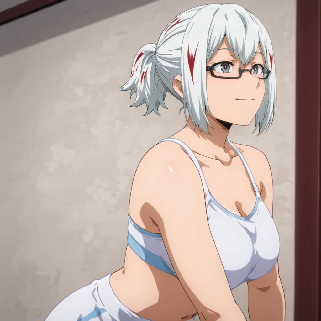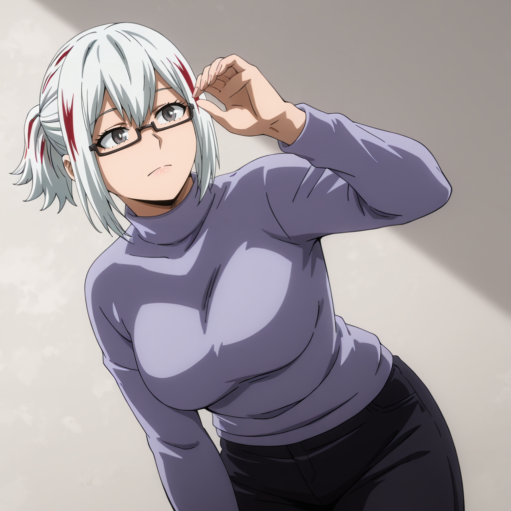 • 触发词:FuyumiMHA, 1girl, glasses, multicolored hair, streaked hair, sweater, red hair, white hair, semi-rimless eyewear, short ponytail, short hair, grey eyes, pants, breasts, long sleeves, cowboy shot