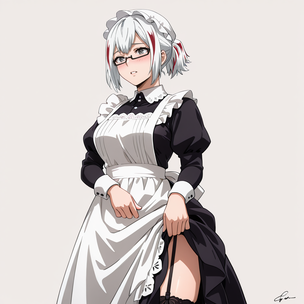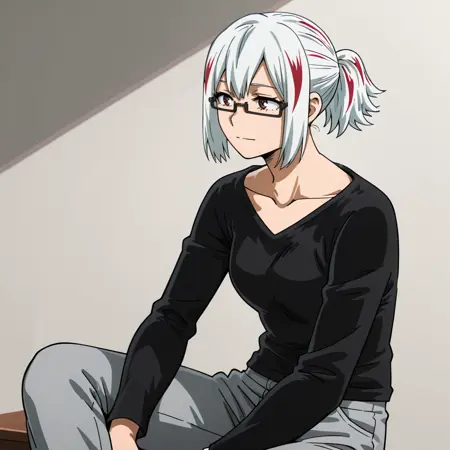• 带黑衬衫的触发词:FuyumiMHABlackShirt, 1girl, glasses, multicolored hair, red hair, streaked hair, short ponytail, white hair, black shirt, semi-rimless eyewear, collarbone, long sleeves, short hair, two-tone hair, pants