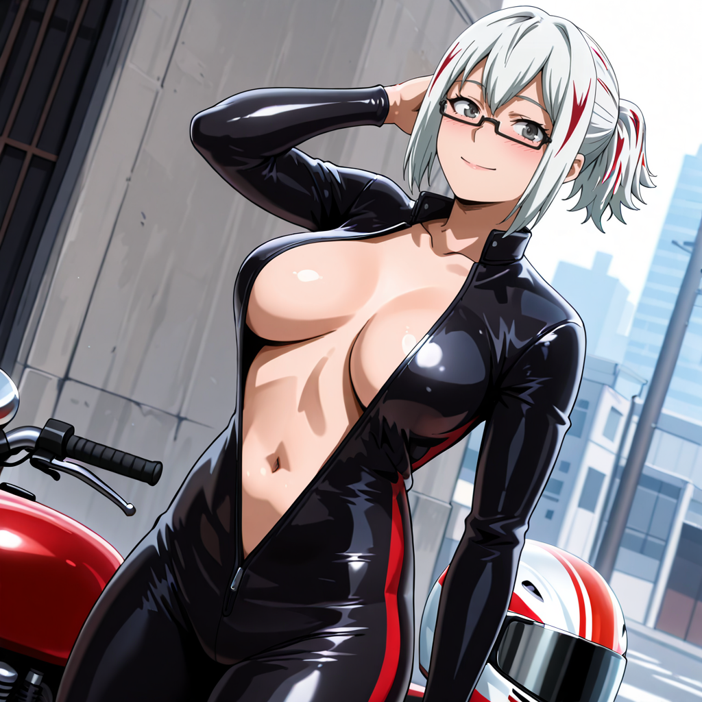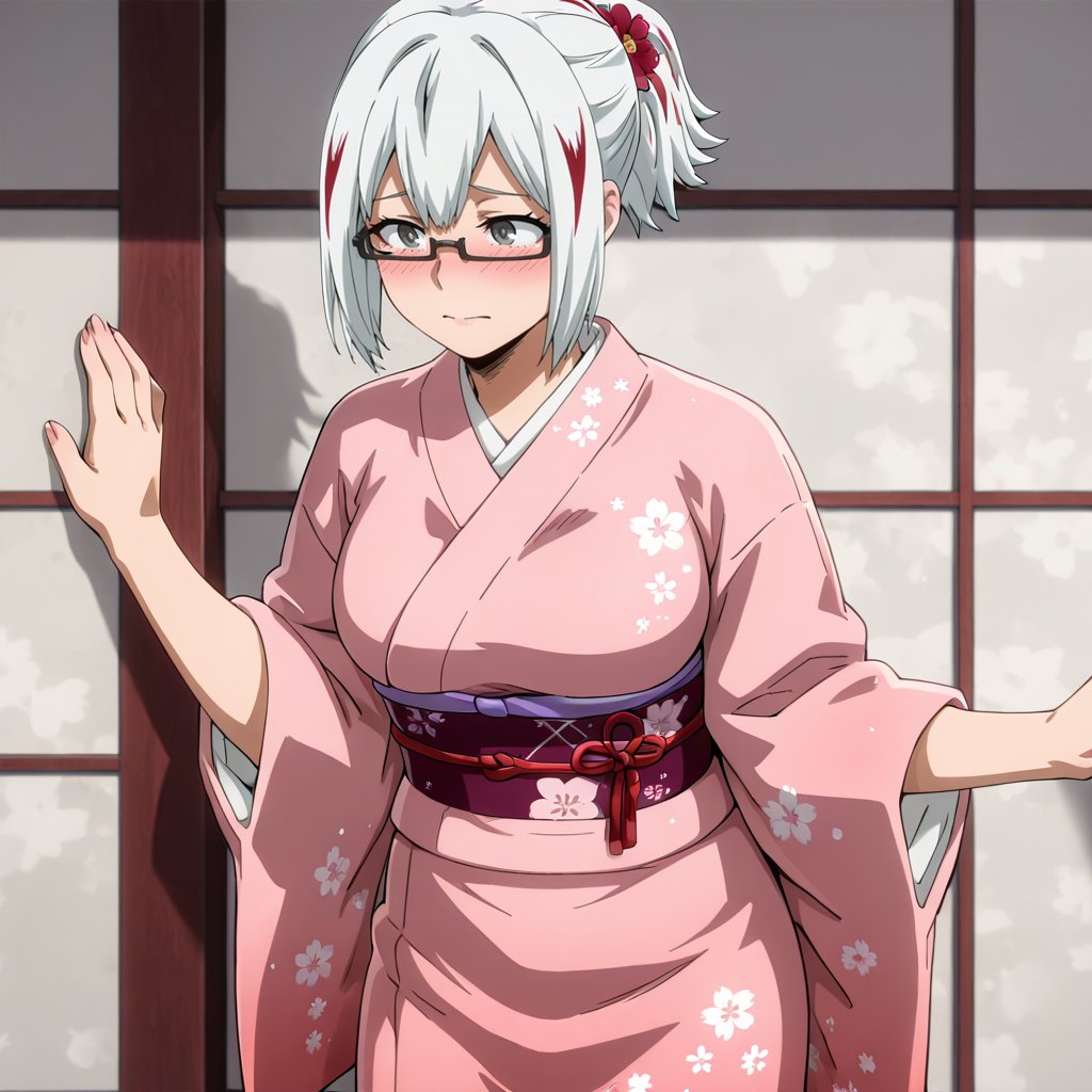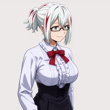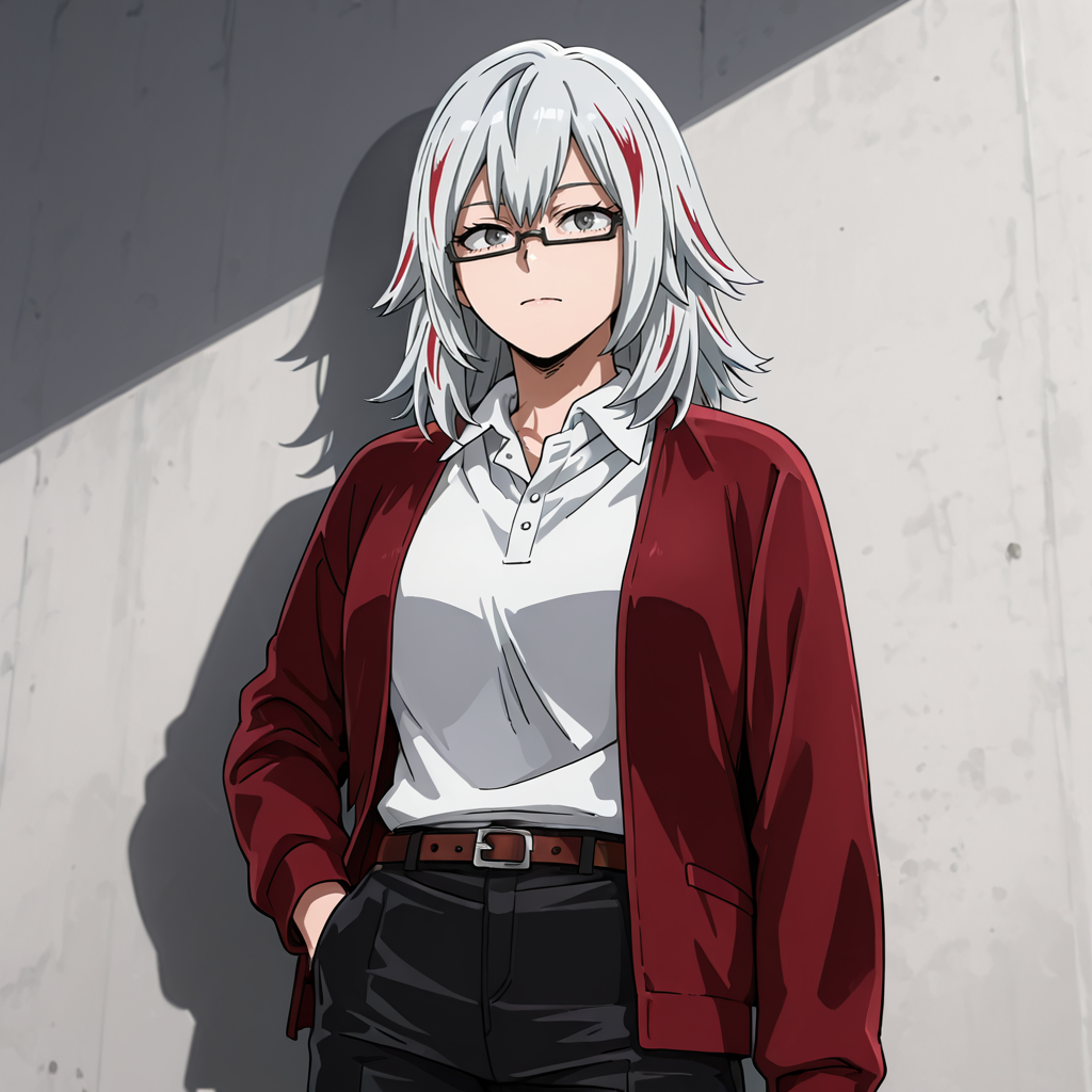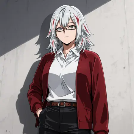 • 带夹克的触发词:FuyumiMHAJacket, 1girl, glasses, black pants, belt, red jacket, white shirt, multicolored hair, red hair, semi-rimless eyewear, white hair, streaked hair, grey eyes, grey hair, medium hair, collared shirt, cowboy shot