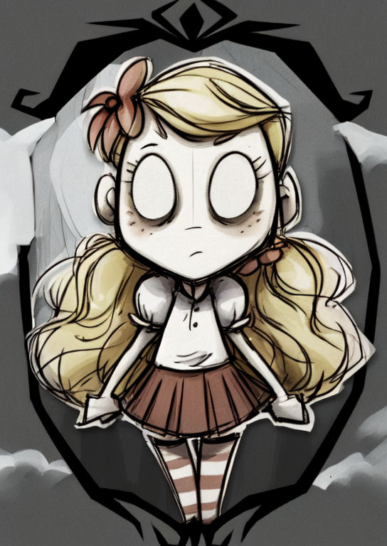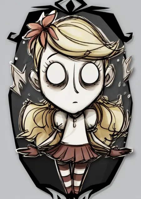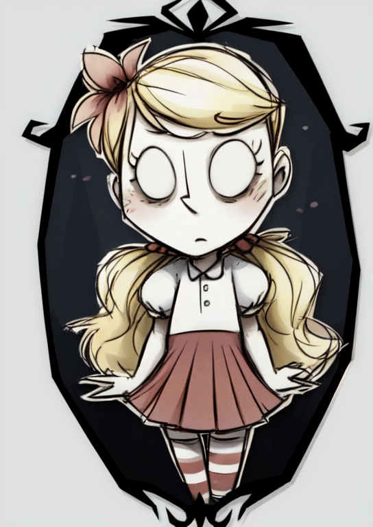 このモデルでは、最小強度は0.8にしてください。それ以下にすると瞳が消え、外見が大きく損なわれてしまいます。まだこのスタイルを再現できるかどうか確信が持てないため、1to3fall5 の「Don't Starve!」用スタイルLoRAの使用を推奨します。重みを約0.5に設定すると、ゲームのスタイルに近い仕上がりになりつつ、自分の好みで自由に調整できるでしょう!